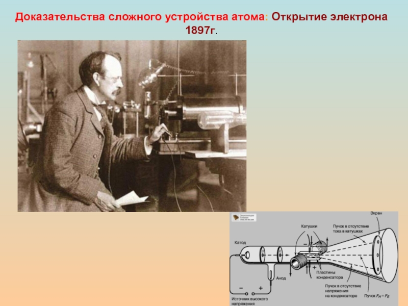 Слайд 5Доказательства сложного устройства атома: Открытие электрона 1897г.