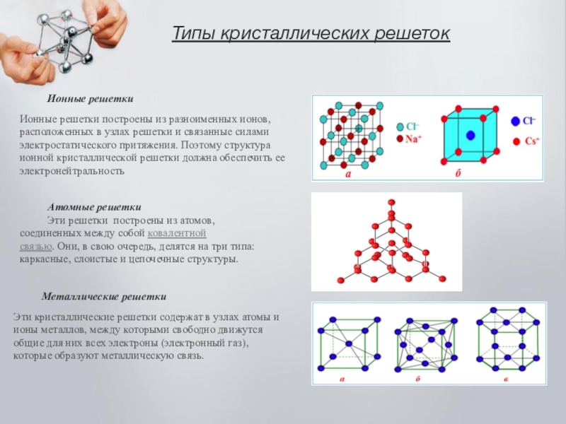 Эти решетки построены из атомов, соединенных между собой ковалентной связью. Они, в свою очередь, делятся на три типа: каркасные, слоистые и цепочечные структуры.