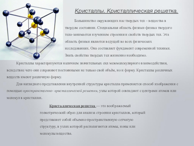 Для наглядного представления внутренней структуры кристалла применяется способ изображения с помощью пространственно- кристаллической решетки, узлы которой совпадают с центрами атомов или молекул в кристаллах.