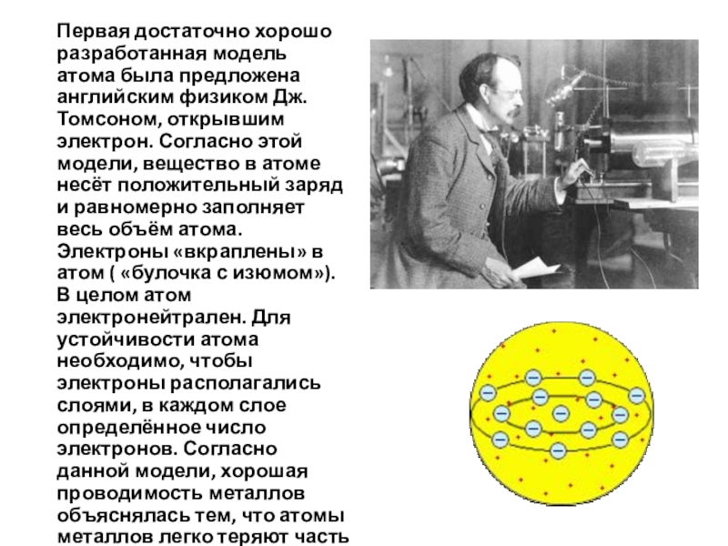 английским физиком Дж. Томсоном, открывшим электрон. Согласно этой модели, вещество в атоме несёт положительный заряд и равномерно заполняет весь объём атома. Электроны «вкраплены» в атом ( «булочка с изюмом»). В целом атом электронейтрален. Для устойчивости атома необходимо, чтобы электроны располагались слоями, в каждом слое определённое число электронов. Согласно данной модели, хорошая проводимость металлов объяснялась тем, что атомы металлов легко теряют часть электронов.