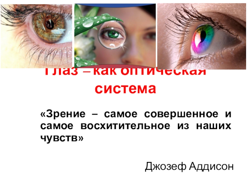 Глаз – как оптическая система«Зрение – самое совершенное и самое восхитительное из наших чувств»Джозеф Аддисон