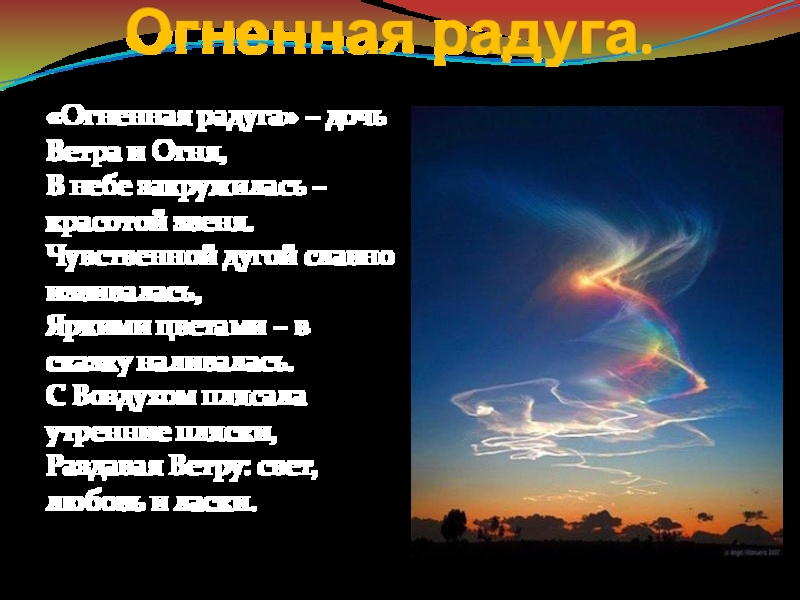 Округло-оризонтальная дуга («огненная радуга»)- это относительно редкий оптический эффект в атмосфере, выражающийся в возникновении