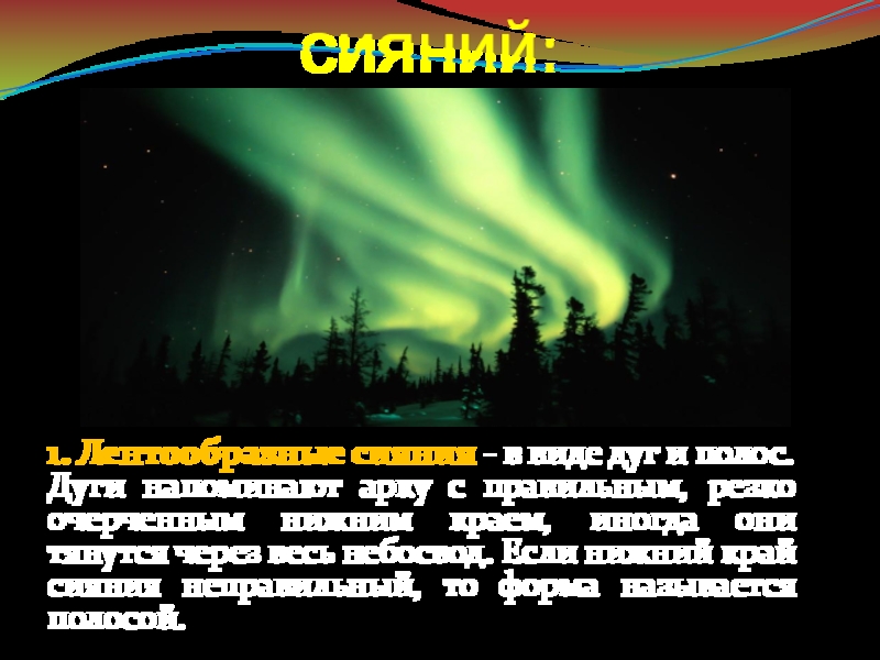 Дуги напоминают арку с правильным, резко очерченным нижним краем, иногда они тянутся через весь небосвод. Если нижний край сияния неправильный, то форма называется полосой.
