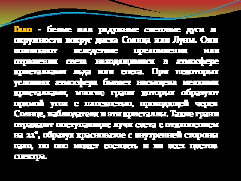 Солнца или Луны. Они возникают вследствие преломления или отражения света находящимися в атмосфере кристаллами льда или снега. При некоторых условиях атмосфера бывает насыщена мелкими кристаллами, многие грани которых образуют прямой угол с плоскостью, проходящей через Солнце, наблюдателя и эти кристаллы. Такие грани отражают поступающие лучи света с отклонением на 22°, образуя красноватое с внутренней стороны гало, но оно может состоять и из всех цветов спектра.