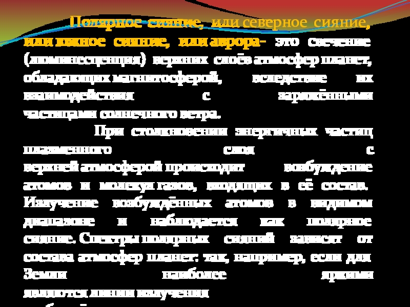 это свечение (люминесценция) верхних слоёв атмосфер планет, обладающих магнитосферой, вследствие их взаимодействия с заряжёнными частицами солнечного ветра.