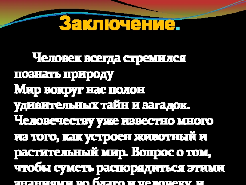 удивительных тайн и загадок. Человечеству уже известно много из того, как устроен животный и растительный мир. Вопрос о том, чтобы суметь распорядиться этими знаниями во благо и человеку, и природе, т. е. выступать не против нее, а сообща с ней. И если мы не способны найти ответ сами, может, стоит посоветоваться с природой.