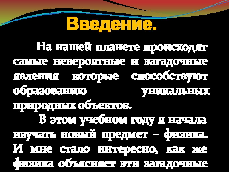 В этом учебном году я начала изучать новый предмет – физика. И мне стало интересно, как же физика объясняет эти загадочные природные явления. Явления бывают нескольких видов: механические, тепловые, электрические, но меня больше всего заинтересовали оптические