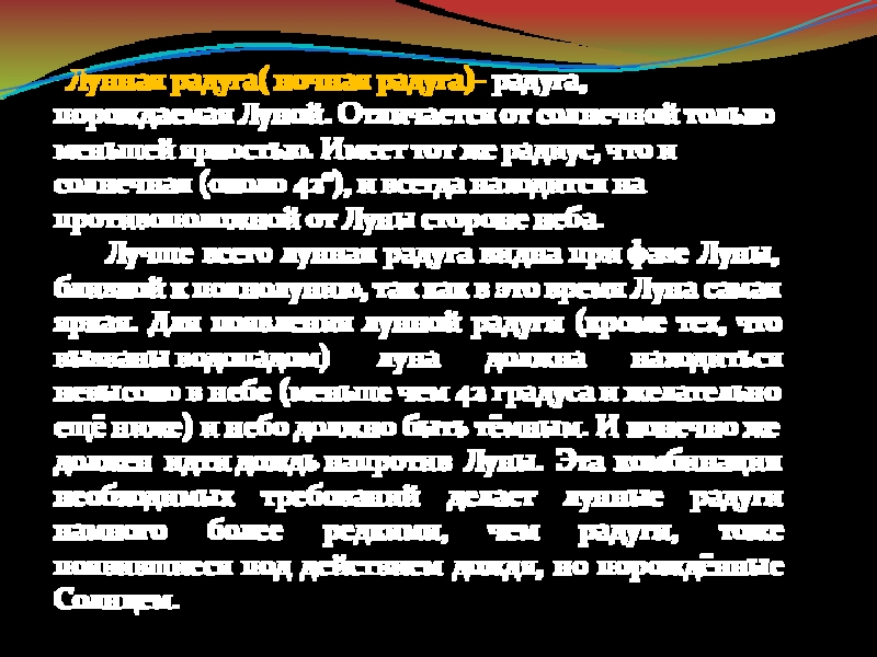 Лунная радуга( ночная радуга)- радуга, порождаемая Луной. Отличается от солнечной только меньшей