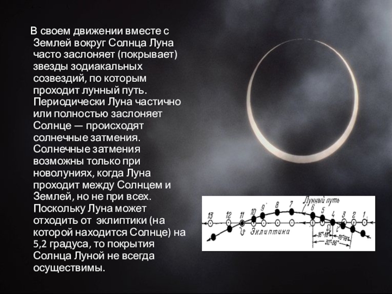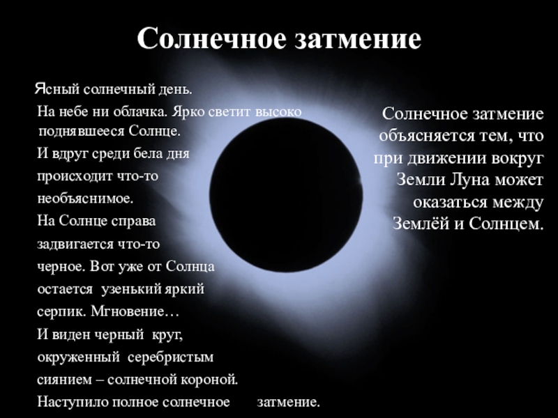 Солнечное затмение объясняется тем, что при движении вокруг Земли Луна может оказаться между Землёй и Солнцем.