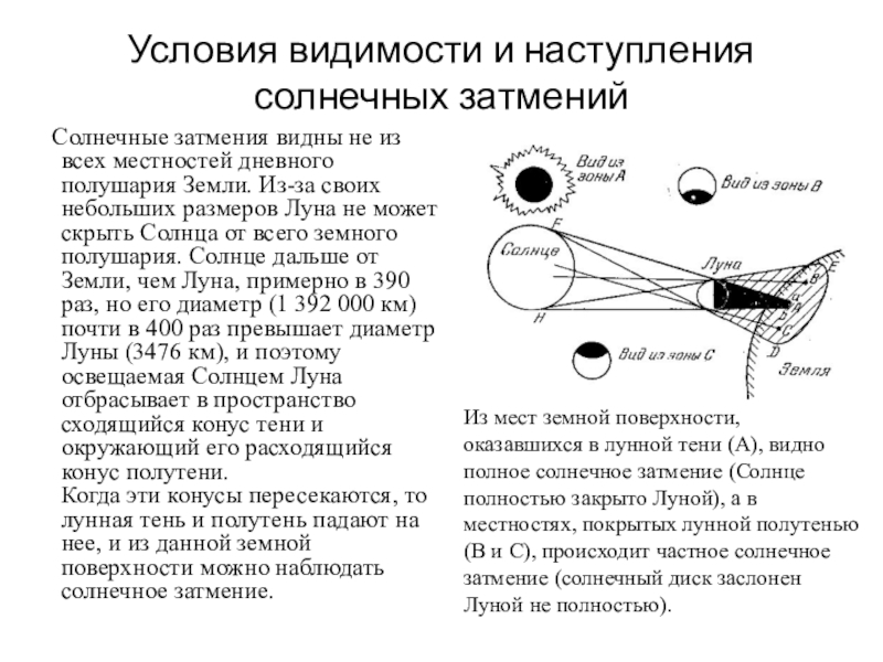 Из мест земной поверхности, оказавшихся в лунной тени (А), видно полное солнечное затмение (Солнце полностью закрыто Луной), а в местностях, покрытых лунной полутенью (В и С), происходит частное солнечное затмение (солнечный диск заслонен Луной не полностью).