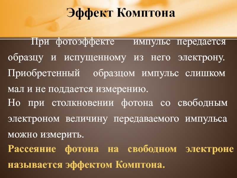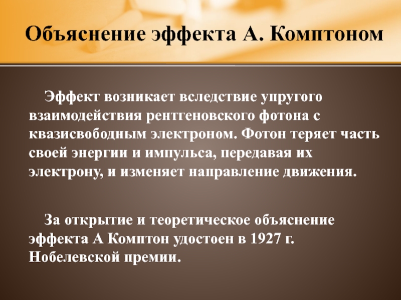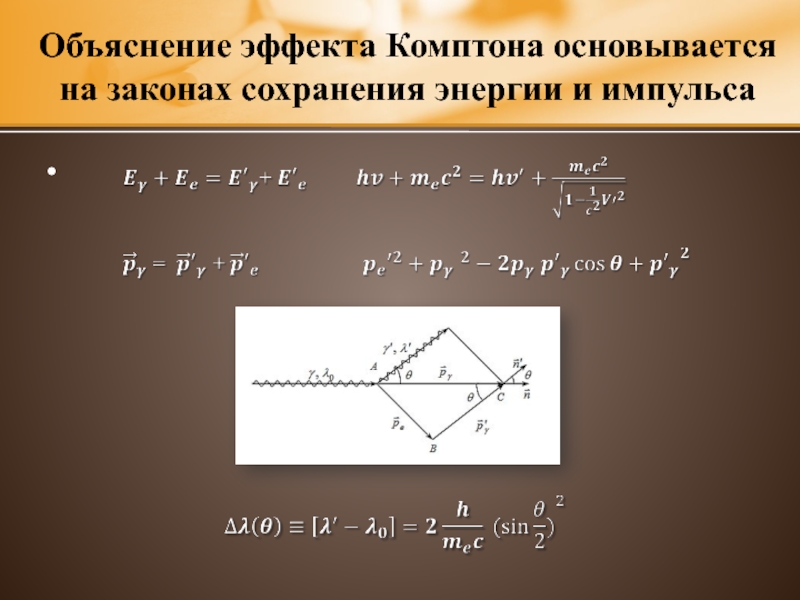 Слайд 31Объяснение эффекта Комптона основывается на законах сохранения энергии и импульса