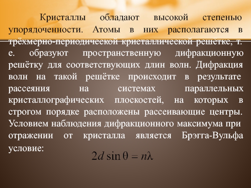 трёхмерно-периодической кристаллической решётке, т.е. образуют пространственную дифракционную решётку для соответствующих длин волн. Дифракция волн на такой решётке происходит в результате рассеяния на системах параллельных кристаллографических плоскостей, на которых в строгом порядке расположены рассеивающие центры. Условием наблюдения дифракционного максимума при отражении от кристалла является Брэгга-Вульфа условие:
