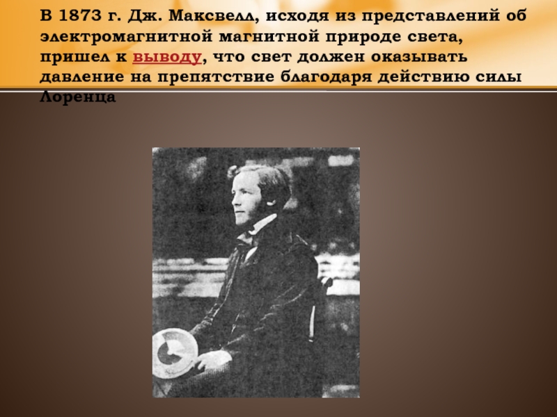 природе света, пришел к выводу, что свет должен оказывать давление на препятствие благодаря действию силы Лоренца