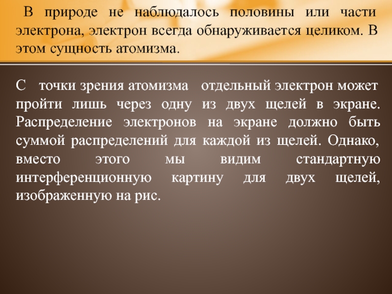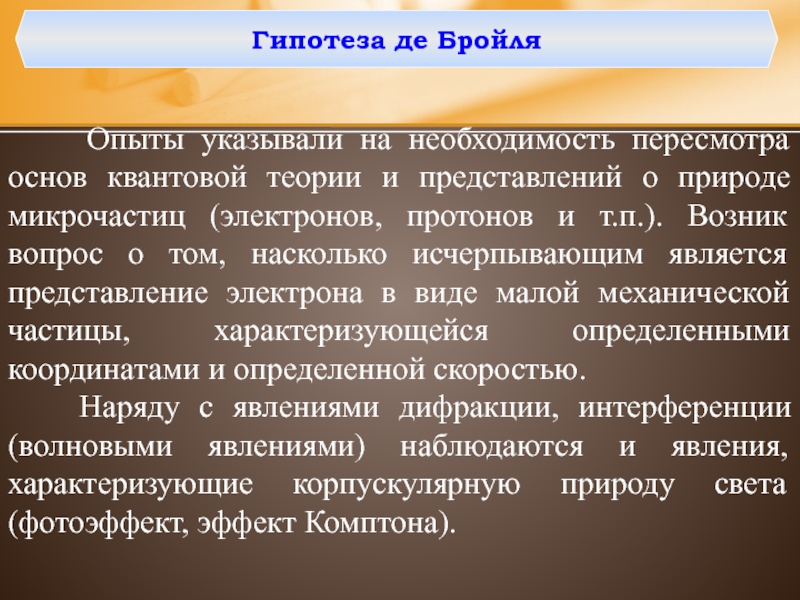 основ квантовой теории и представлений о природе микрочастиц (электронов, протонов и т.п.). Возник вопрос о том, насколько исчерпывающим является представление электрона в виде малой механической частицы, характеризующейся определенными координатами и определенной скоростью.