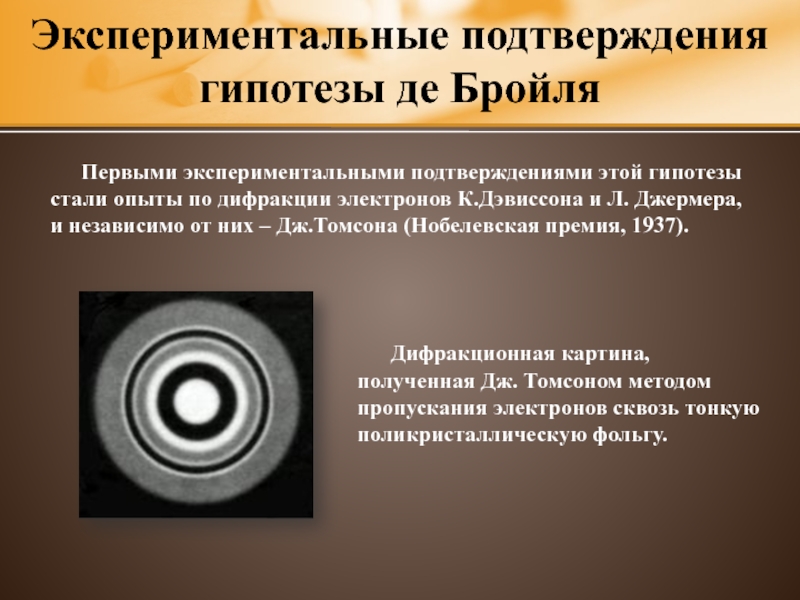 Первыми экспериментальными подтверждениями этой гипотезы стали опыты по дифракции электронов К.Дэвиссона и Л. Джермера, и независимо от них – Дж.Томсона (Нобелевская премия, 1937).