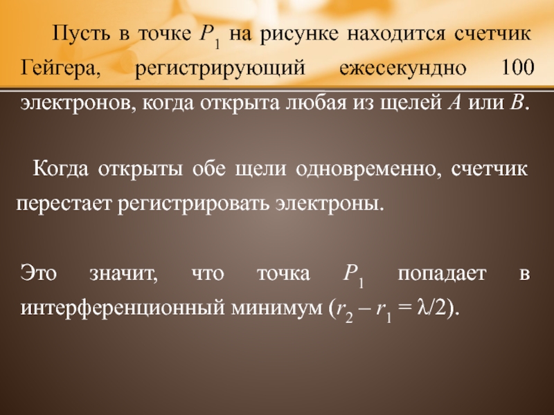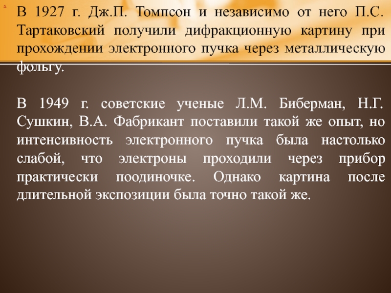 В 1949 г. советские ученые Л.М. Биберман, Н.Г. Сушкин, В.А. Фабрикант поставили такой же опыт, но интенсивность электронного пучка была настолько слабой, что электроны проходили через прибор практически поодиночке. Однако картина после длительной экспозиции была точно такой же.