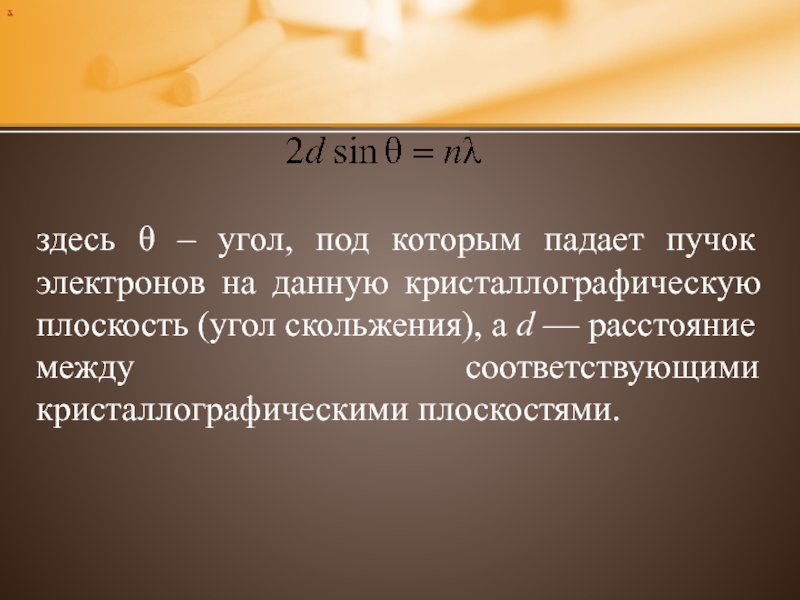 кристаллографическую плоскость (угол скольжения), а d — расстояние между соответствующими кристаллографическими плоскостями.