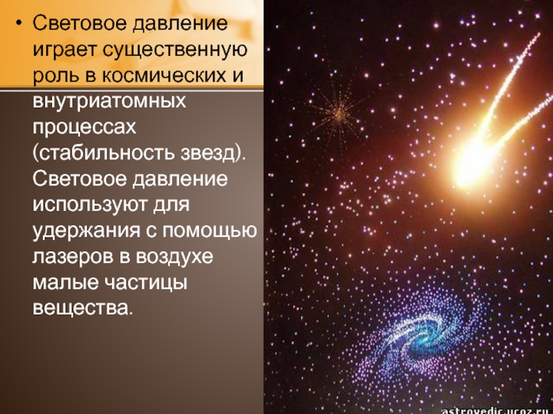 Слайд 19Световое давление играет существенную роль в космических и внутриатомных процессах (стабильность
