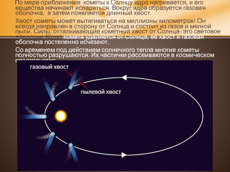 нагревается, и его вещества начинают испаряться. Вокруг ядра образуется газовая оболочка, а затем появляется длинный хвост.