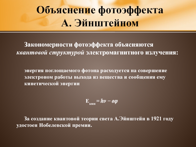 За создание квантовой теории света А.Эйнштейн в 1921 году удостоен Нобелевской премии.