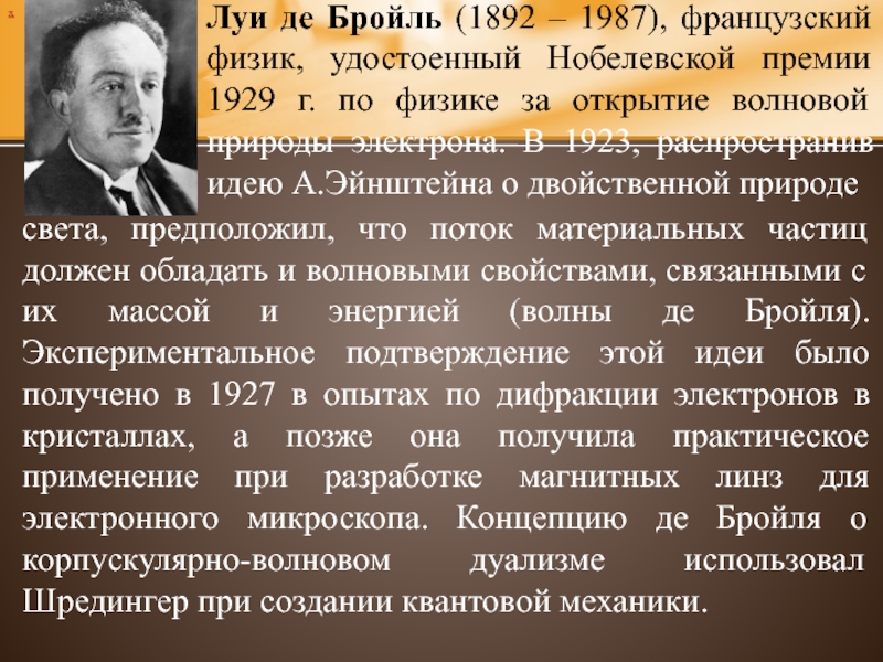 1929 г. по физике за открытие волновой природы электрона. В 1923, распространив идею А.Эйнштейна о двойственной природе