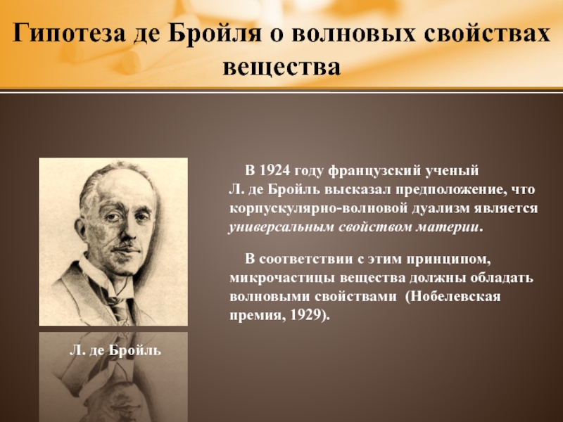 В соответствии с этим принципом, микрочастицы вещества должны обладать волновыми свойствами (Нобелевская премия, 1929).