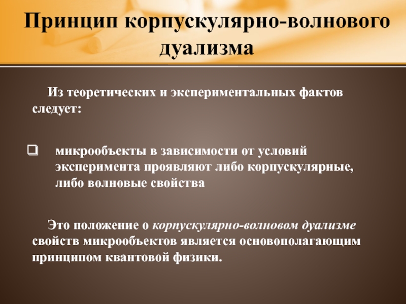 Это положение о корпускулярно-волновом дуализме свойств микрообъектов является основополагающим принципом квантовой физики.