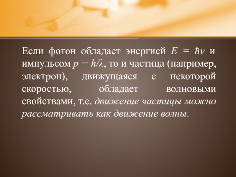 h/λ, то и частица (например, электрон), движущаяся с некоторой скоростью, обладает волновыми свойствами, т.е. движение частицы можно рассматривать как движение волны.