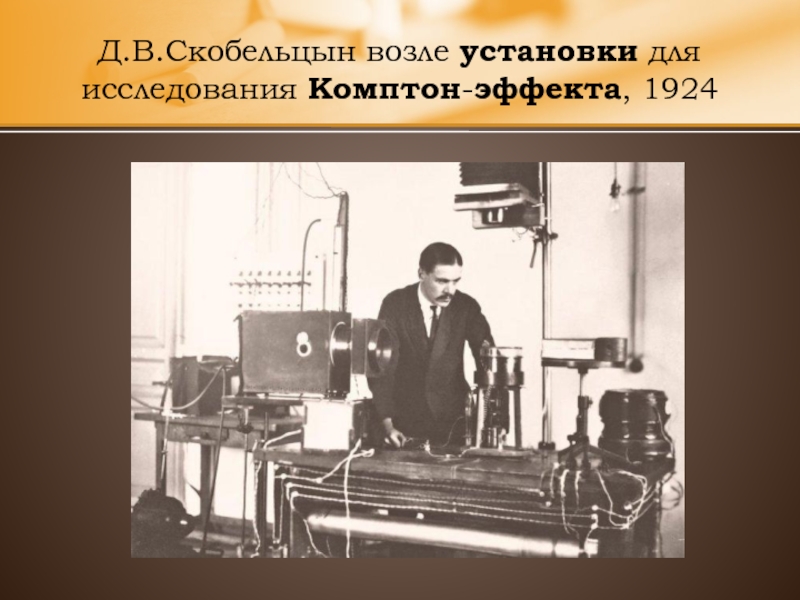 Слайд 27Д.В.Скобельцын возле установки для исследования Комптон-эффекта, 1924