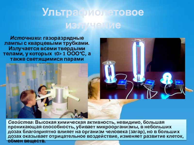 Свойства: Высокая химическая активность, невидимо, большая проникающая способность, убивает микроорганизмы, в небольших дозах благоприятно влияет на организм человека (загар), но в больших дозах оказывает отрицательное воздействие, изменяет развитие клеток, обмен веществ.