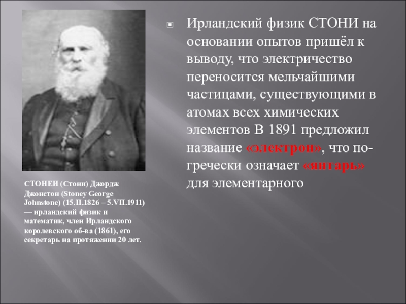 Ирландский физик СТОНИ на основании опытов пришёл к выводу, что электричество переносится мельчайшими частицами, существующими в атомах всех химических элементов В 1891 предложил название «электрон», что по-гречески означает «янтарь» для элементарного
