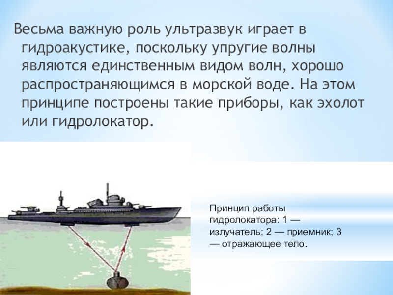 Принцип работы гидролокатора: 1 — излучатель; 2 — приемник; 3 — отражающее тело.