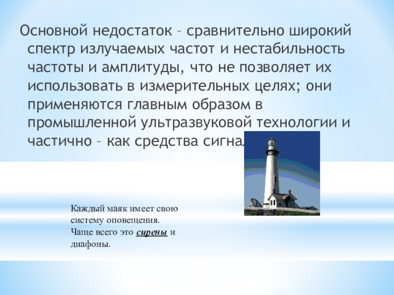 Каждый маяк имеет свою систему оповещения. Чаще всего это сирены и диафоны.