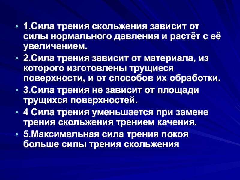1.Сила трения скольжения зависит от силы нормального давления и растёт с её увеличением.2.Сила трения зависит от материала,
