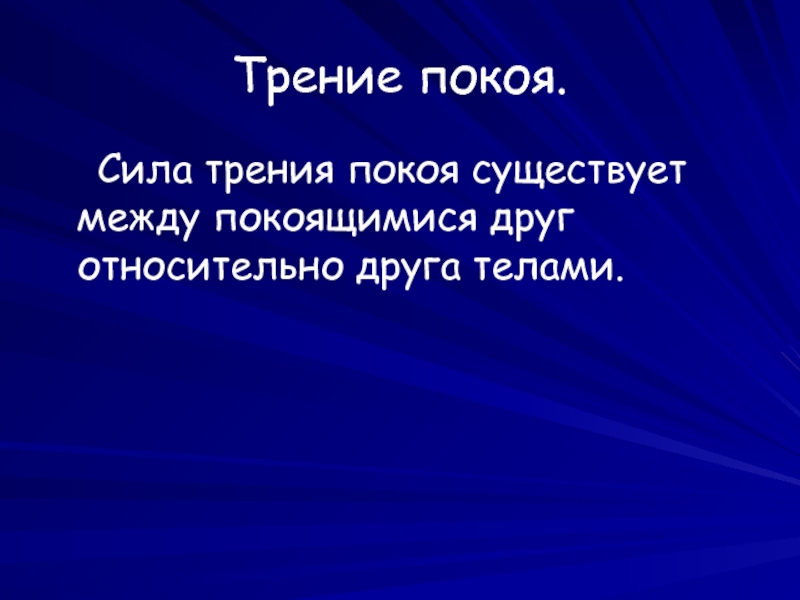 Трение покоя.   Сила трения покоя существует между покоящимися друг относительно друга телами.