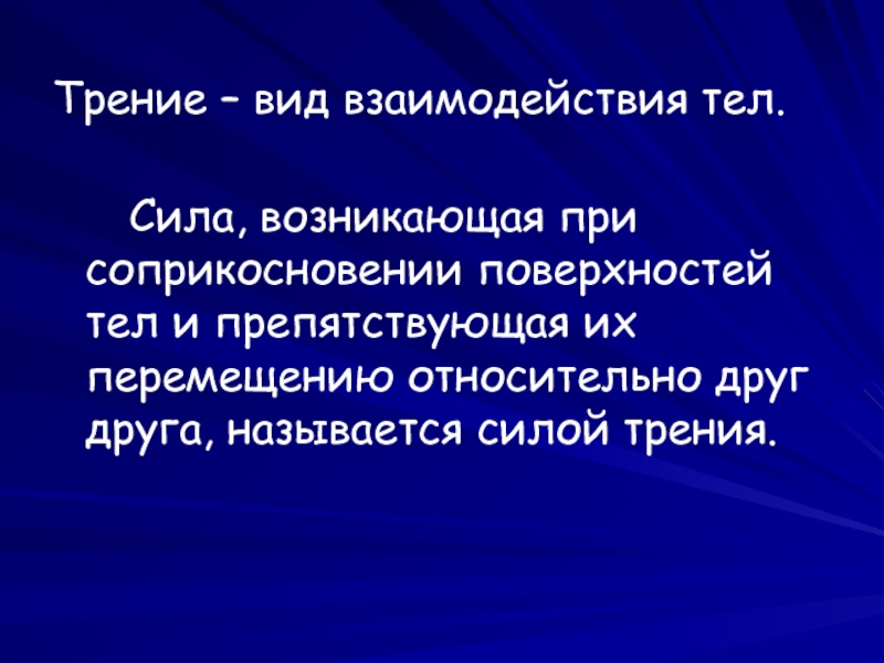 Трение – вид взаимодействия тел.        Сила, возникающая при соприкосновении поверхностей