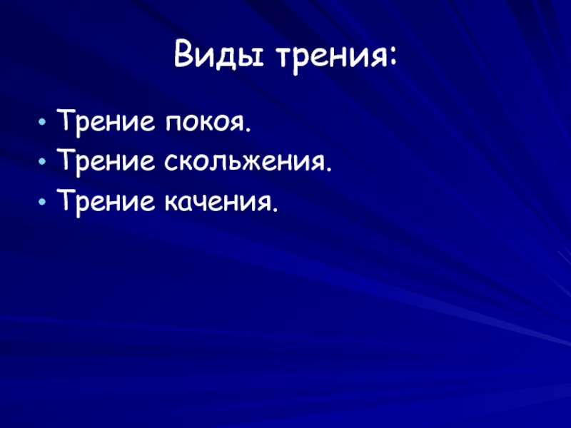 Виды трения:Трение покоя.Трение скольжения.Трение качения.