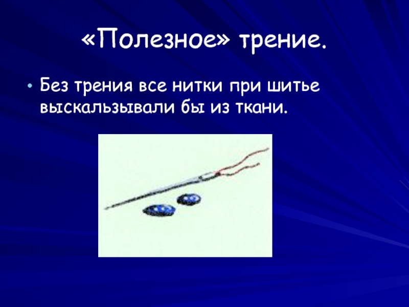 «Полезное» трение.Без трения все нитки при шитье выскальзывали бы из ткани.