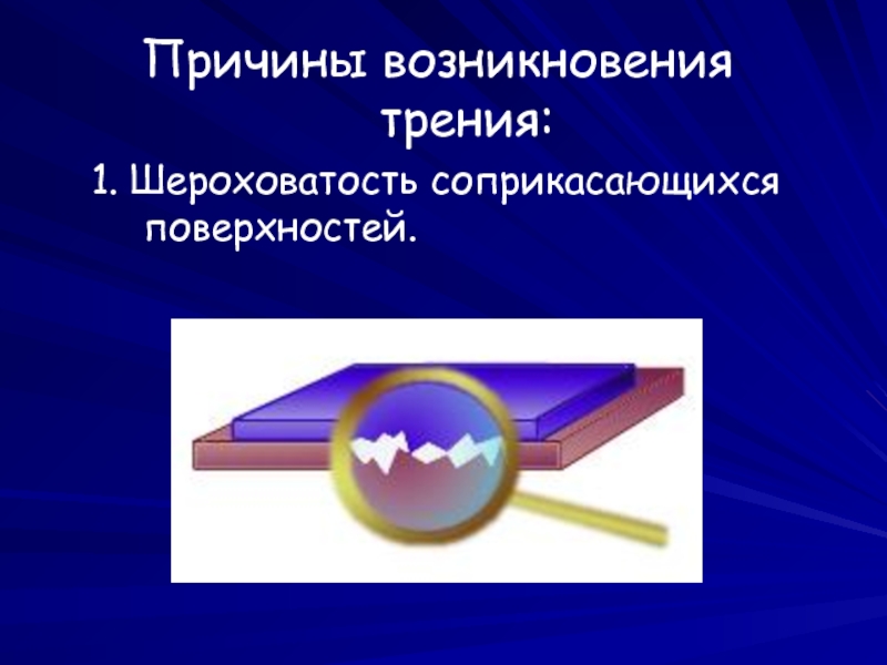 Причины возникновения трения:1. Шероховатость соприкасающихся поверхностей.