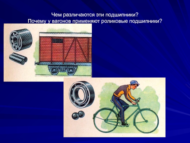 Слайд 25Чем различаются эти подшипники? Почему у вагонов применяют роликовые подшипники?