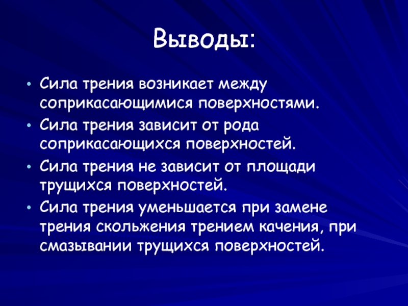 Выводы:Сила трения возникает между соприкасающимися поверхностями.Сила трения зависит от рода соприкасающихся поверхностей.Сила трения не зависит от площади