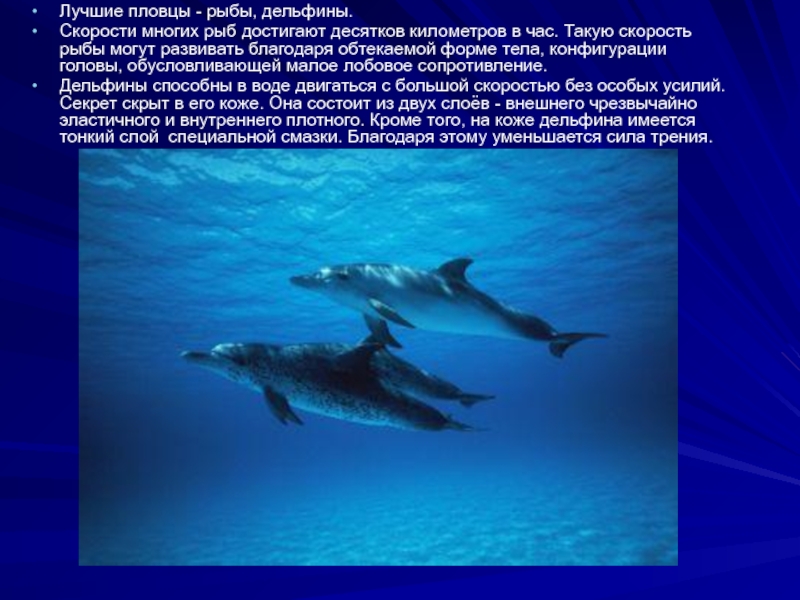 Слайд 32Лучшие пловцы - рыбы, дельфины.
