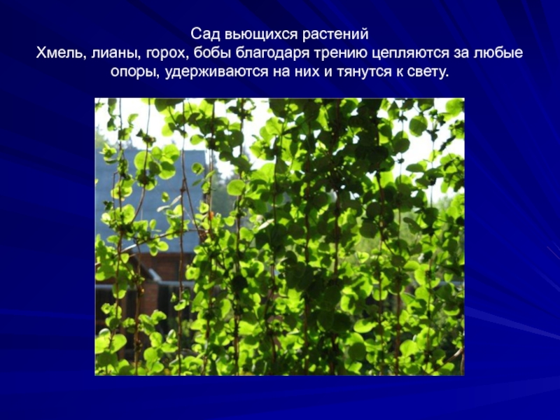 Слайд 31Сад вьющихся растений Хмель, лианы, горох, бобы благодаря трению цепляются за любые