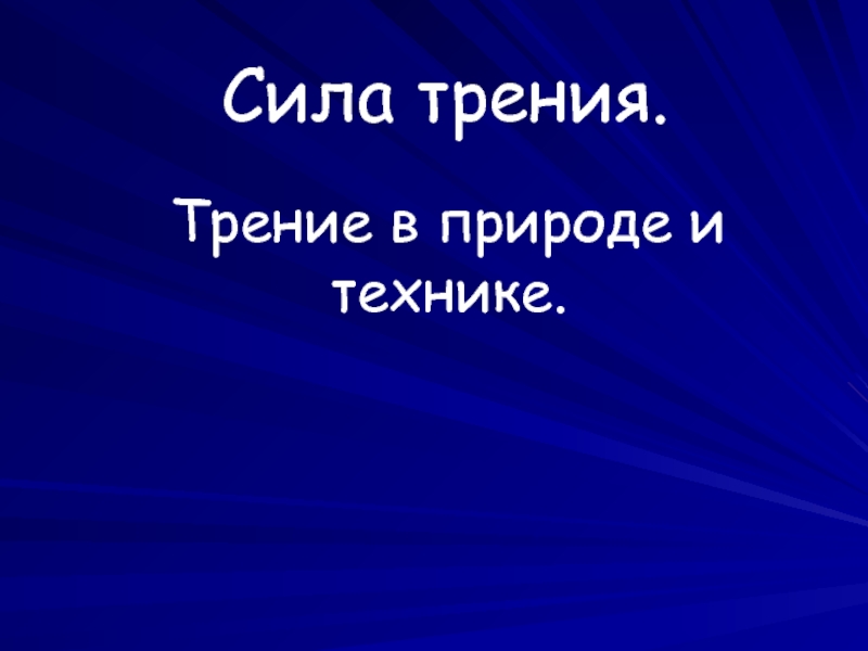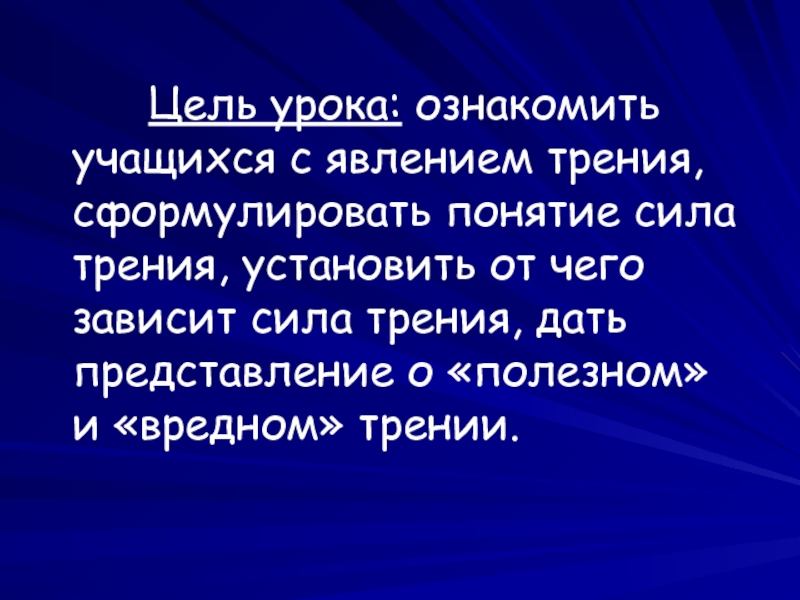 Цель урока: ознакомить учащихся с явлением трения, сформулировать понятие сила трения, установить от чего зависит сила трения, дать представление о «полезном» и «вредном» трении.