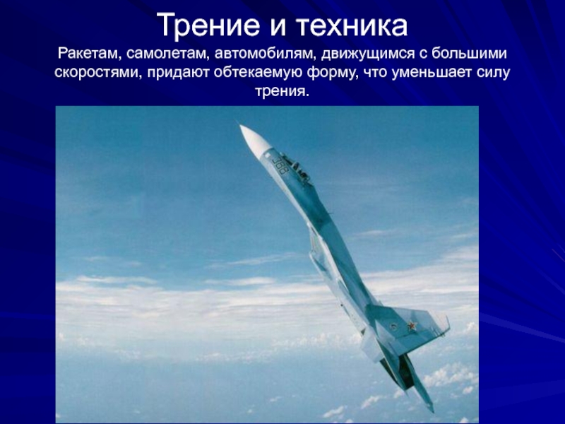Слайд 26Трение и техника Ракетам, самолетам, автомобилям, движущимся с большими скоростями, придают обтекаемую