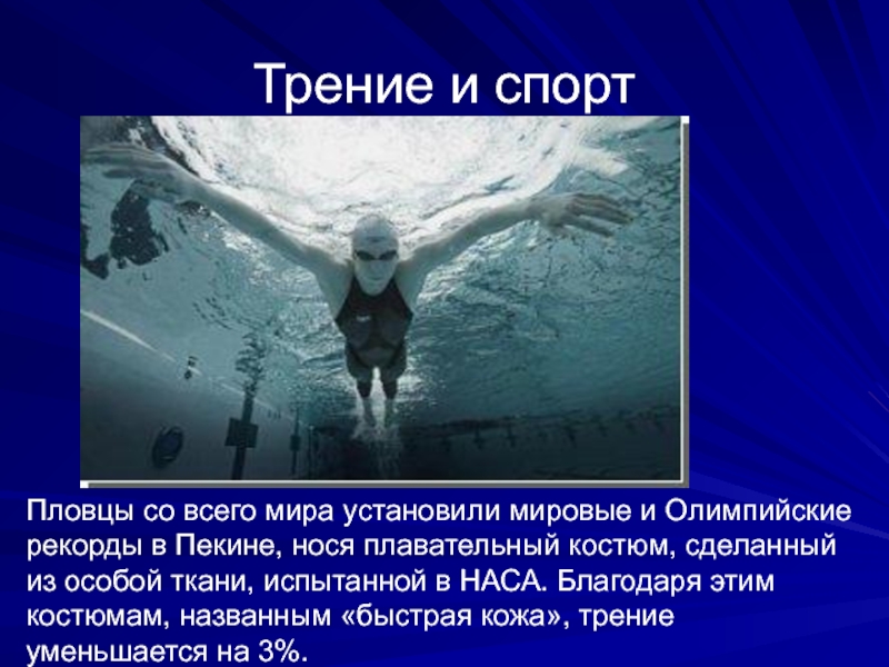 Трение и спортПловцы со всего мира установили мировые и Олимпийские рекорды в Пекине, нося плавательный костюм, сделанный