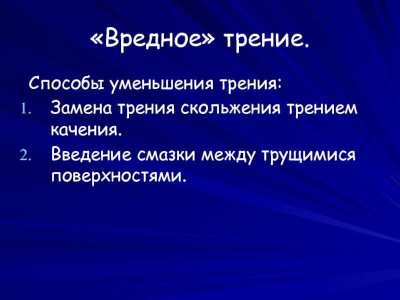«Вредное» трение. Способы уменьшения трения:Замена трения скольжения трением качения.Введение смазки между трущимися поверхностями.