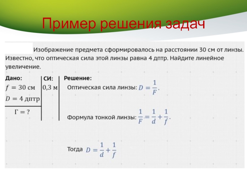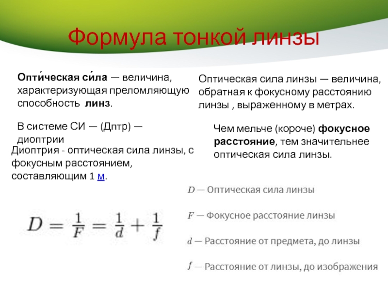 Оптическая сила линзы — величина, обратная к фокусному расстоянию линзы , выраженному в метрах.