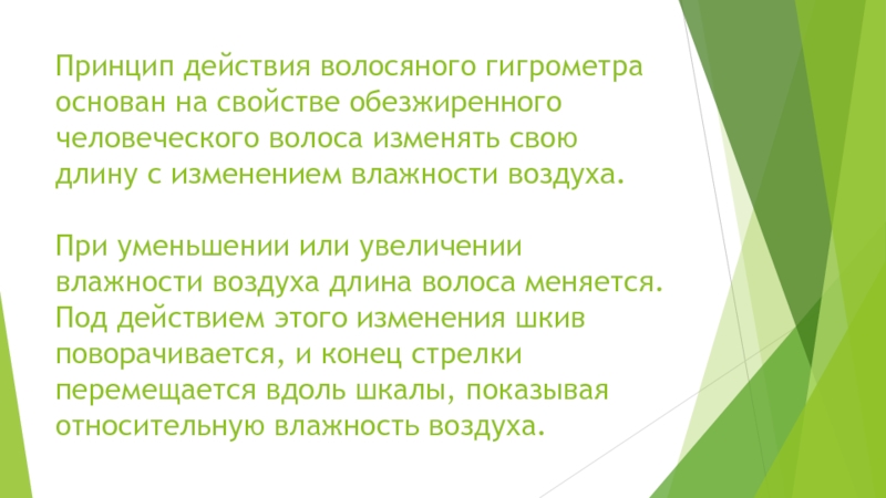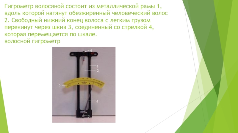 Слайд 6Принцип действия волосяного гигрометра основан на свойстве обезжиренного человеческого волоса изменять