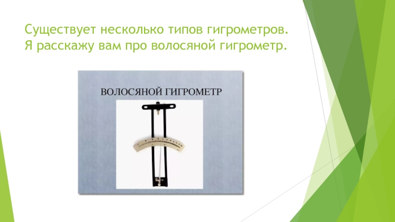 Слайд 3Существует несколько типов гигрометров. Я расскажу вам про волосяной гигрометр.